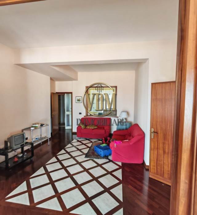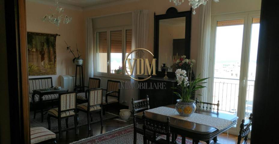 Internamente, l'appartamento è ben mantenuto e presenta una disposizione funzionale. È composto da un grande salone con balcone, una cucina abitabile, doppi servizi, una camera matrimoniale e tre camere singole. Completano la proprietà una lavanderia e un ripostiglio.
